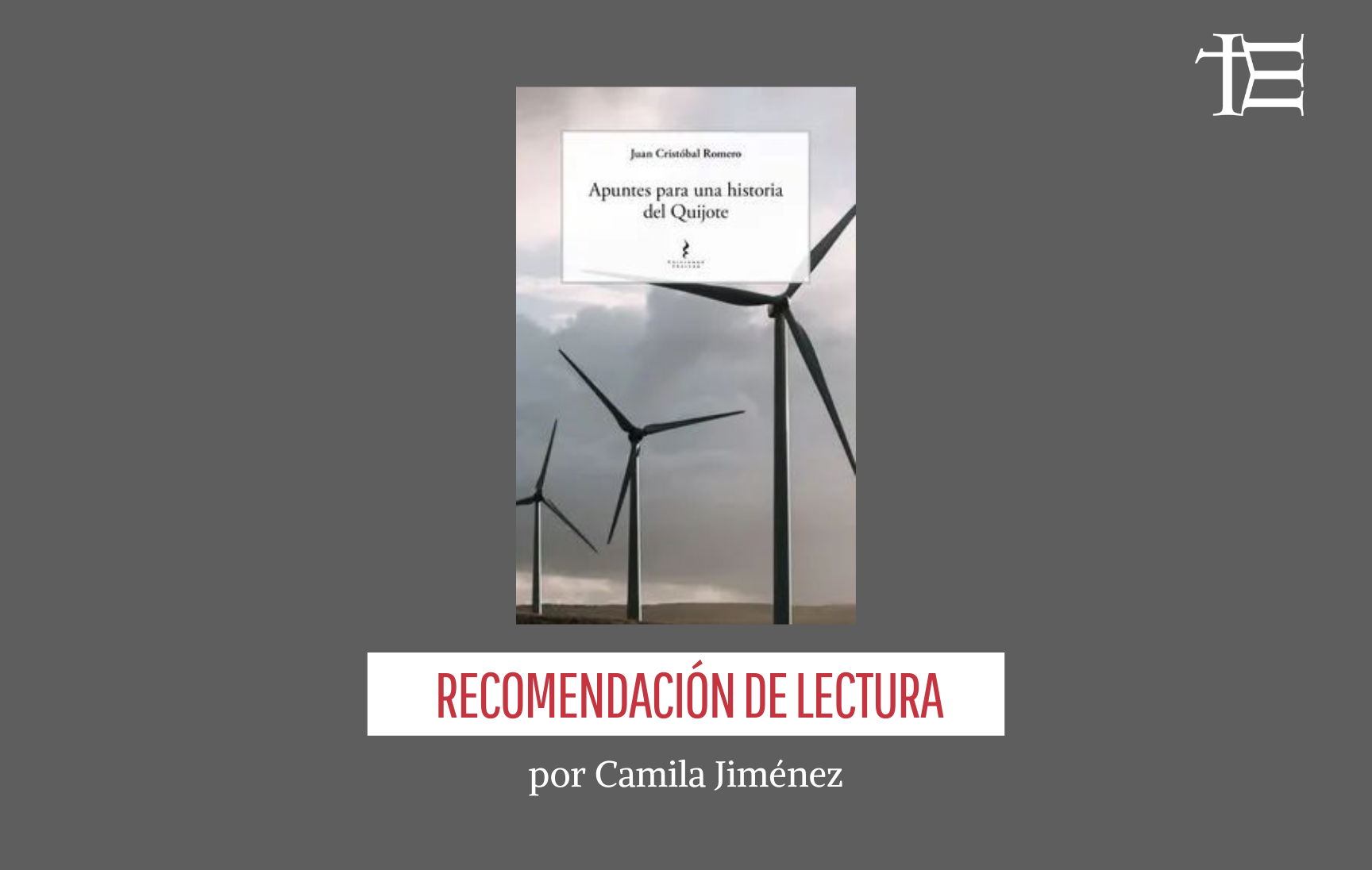 Además, hay en este breve libro un intento de traer a Cervantes al presente. Romero pretende ilustrar de qué manera podríamos entender en la actualidad el mundo de Don Quijote. Dos ejemplos de estos son la portada, cuyos aerogeneradores evocan los característicos molinos, y otros paralelismos como: “Alonso Quijano, a principios del siglo XVII, vagaba revestido de una armadura de finales del siglo XV. Lo que hoy equivaldría a vestirse con un uniforme de la Guerra del Pacífico” (p.67).